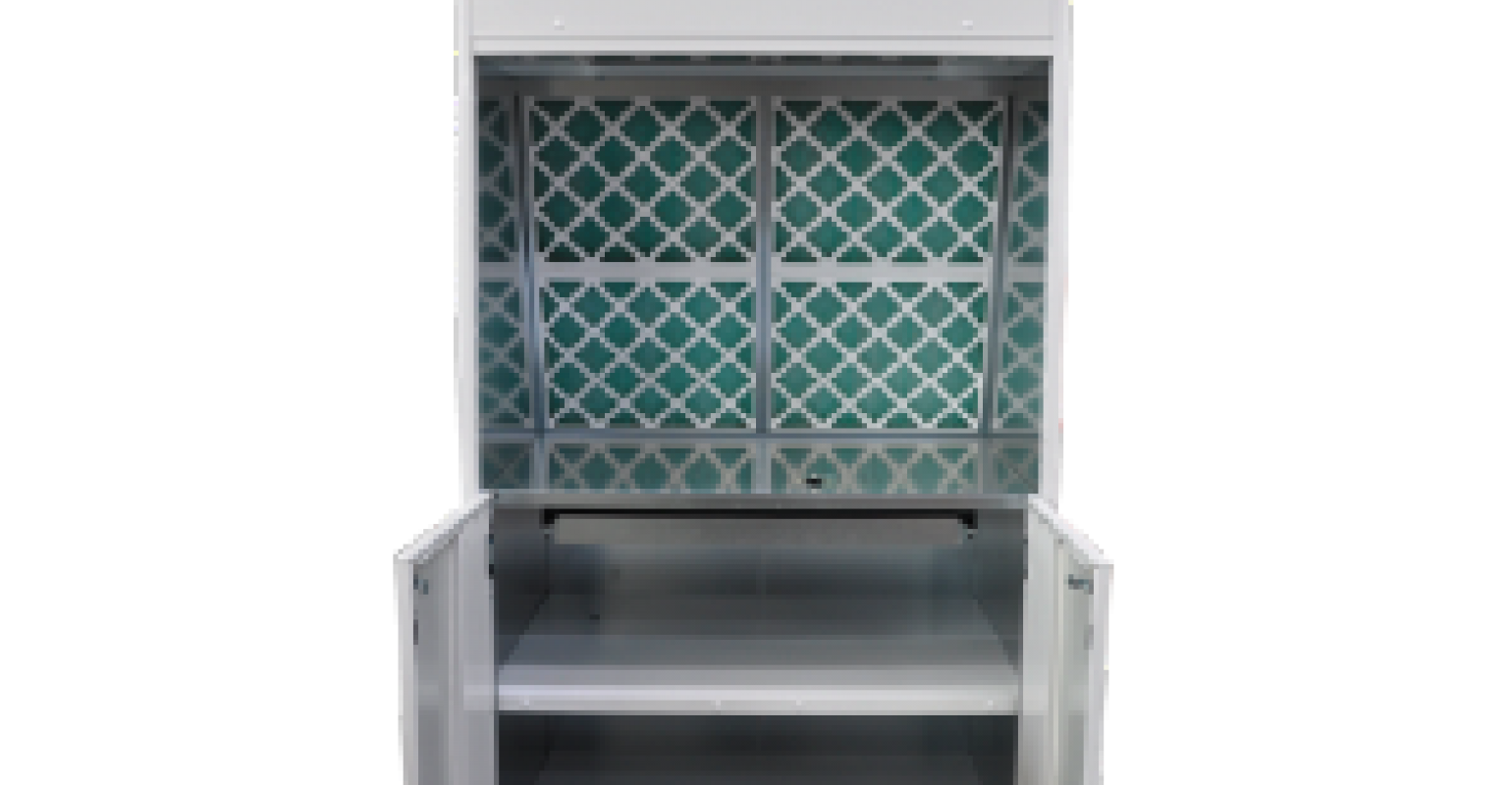 The cabinet is equipped with shelves in the lower part and an air extraction fan in the upper part. It is well-lit and equipped with 4 sets of glass filters in a cardboard frame, so they can be replaced easily.